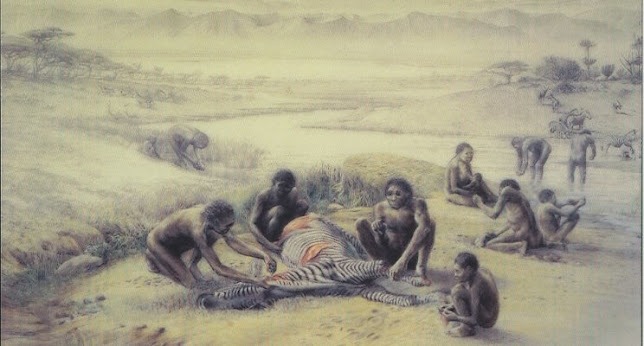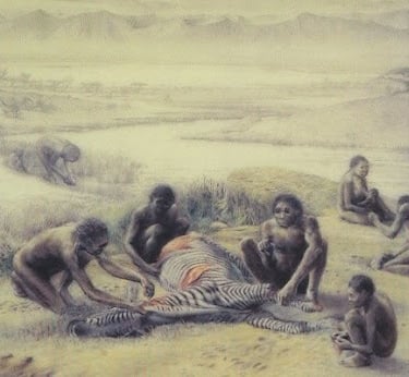 Con esto sobre la mesa, energía para el cerebro y las tripas, los australopitecos tenían el más largo de los tubos digestivos de nuestros antepasados más lejanos. Eran básicamente herbívoros y se alimentaban a base de frutas, tubérculos, hojas y yemas, y esporádicamente de algún pequeño animal (casi como los chimpancés actuales). ¿Cómo es que a partir de entonces el aparato digestivo se fue reduciendo a la vez que agrandando el cerebro? Está claro que tuvo que pasar algo para que parte de la inversión energética para digerir alimentos fuera a parar a nuestra castaña. Y eso fue un cambio (y mejora) de la alimentación.